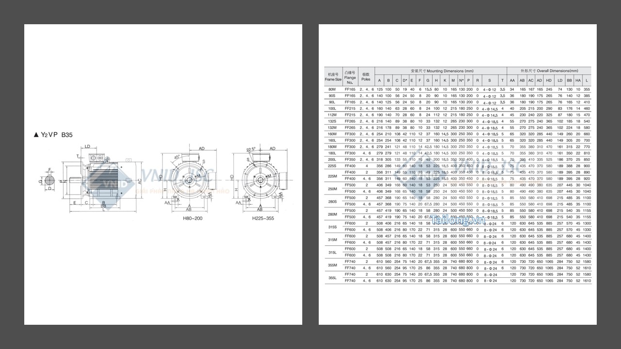 Dưới đây là kiểu lắp đặt và kích thước của động cơ YVP  (Y2VP)