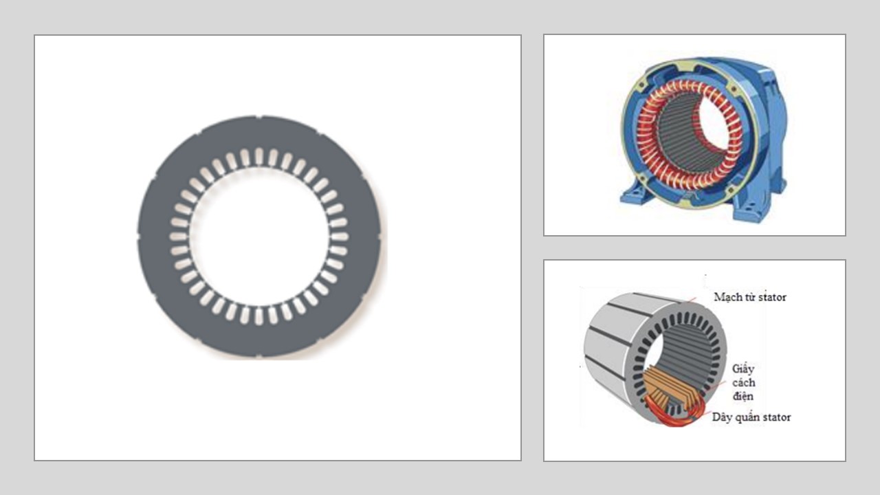 + Stator: là do nhiều lá thép kỹ thuật điện đã dập sẵn, ghép cách điện với nhau.