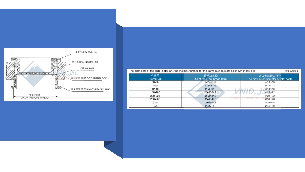 - Hộp đấu nối (terminal box): Vị trí thông thường của hộp đấu dây là ở mặt trên khi nhìn vào đầu dẫn động của động cơ, nhưng có thể bố trí ở phía bên trái hoặc bên phải nếu được chỉ định khi đặt hàng. Cáp nguồn có thể được luồn ra ngoài qua ổ cắm của hộp đầu cuối theo bốn hướng, có kết cấu bịt kín ở ổ cắm