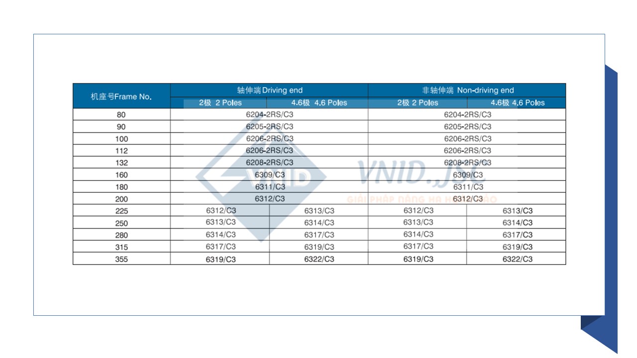 - Vòng bi: Các loại vòng bi được sử dụng cho động cơ Tailong được liệt kê theo bảng kê dưới đây: