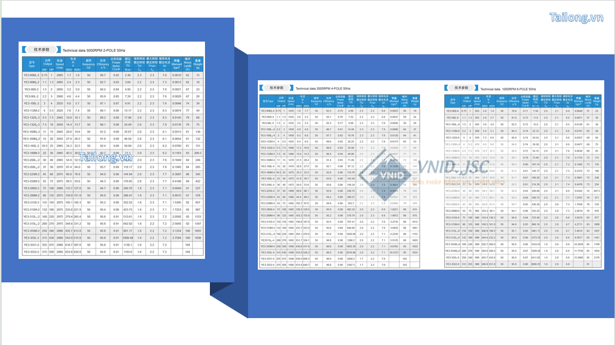 Hình ảnh: Thông số kỹ thuật cơ bản của động cơ không đồ bộ ba pha YE3 - Tailong, TQ